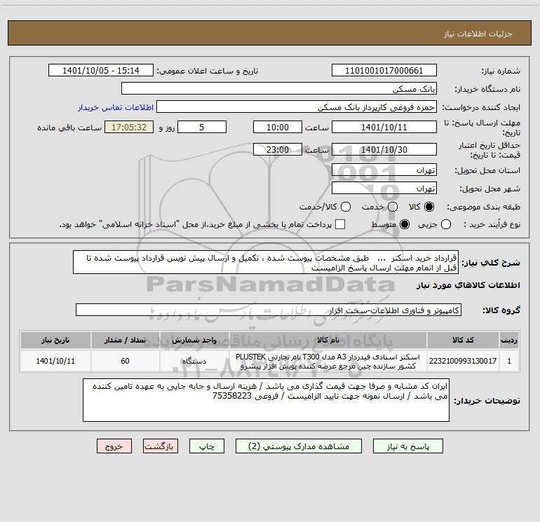شرح کلی نیاز: قرارداد خرید اسکنر ... طبق مشخصات پیوست شده ، تکمیل و ارسال پیش نویس قرارداد پیوست شده تا قبل از اتمام مهلت ارسال پاسخ الزامیست