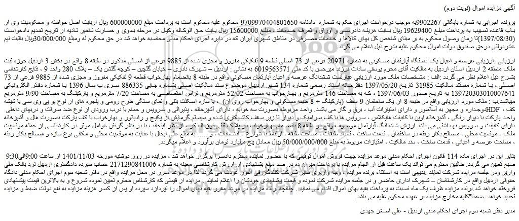 بنابر این در اجرای ماده 114 قانون اجرای احکام مدنی موعد مزایده جهت فروش اموال توقیفی که با حضور نماینده محترم دادسرا برگزار خواهد شد ، مزایده در روز دوشنبه مورخه 1401/11/03 از ساعت 9:00الی9:30 صبح تعیین می گردد. طالبین محترم می تواند یک ساعت قبل از انجام مزایده با پرداخت میزان ده در صد مبلغ پشنهادی از ارزش کارشناسی معینه به شماره 2171290841006 حساب سپرده دادگستری اردبیل نزد بانک ملی واریز ودر جلسه مزایده شرکت نمایند .بدیهی است به استثناء برنده مزایده ، وجه واریزی سایر شرکت کنندگان فی الفور عودت می گردد لذا در موعد مقرر در محل مزایده واقع در دفتر شعبه سوم اجرای احکام مدنی دادگاه حقوقی اردبیل واقع در کارشناسان – شهرک اداری حاضر و در جلسه مزایده شرکت نموده و قیمت پیشنهادی خودشان را اعلام نمایند . مزایده از قیمتی که کارشناس محترم تعیین نموده شروع و به بالاترین قیمت پیشنهادی فروخته خواهد شد.برنده مزایده ظرف یک ماه نسبت به پرداخت بقیه بهای اموال اقدام می نماید . چنانچه برنده مزایده در موعد مقرر بقیه بهای اموال را نپردازد سپرده او پس از کسر هزینه مزایده به نفع دولت ضبط و مزایده تجدید خواهد .ضمنا"کلیه مخارج مزایده بر عهده محکوم علیه می باشد