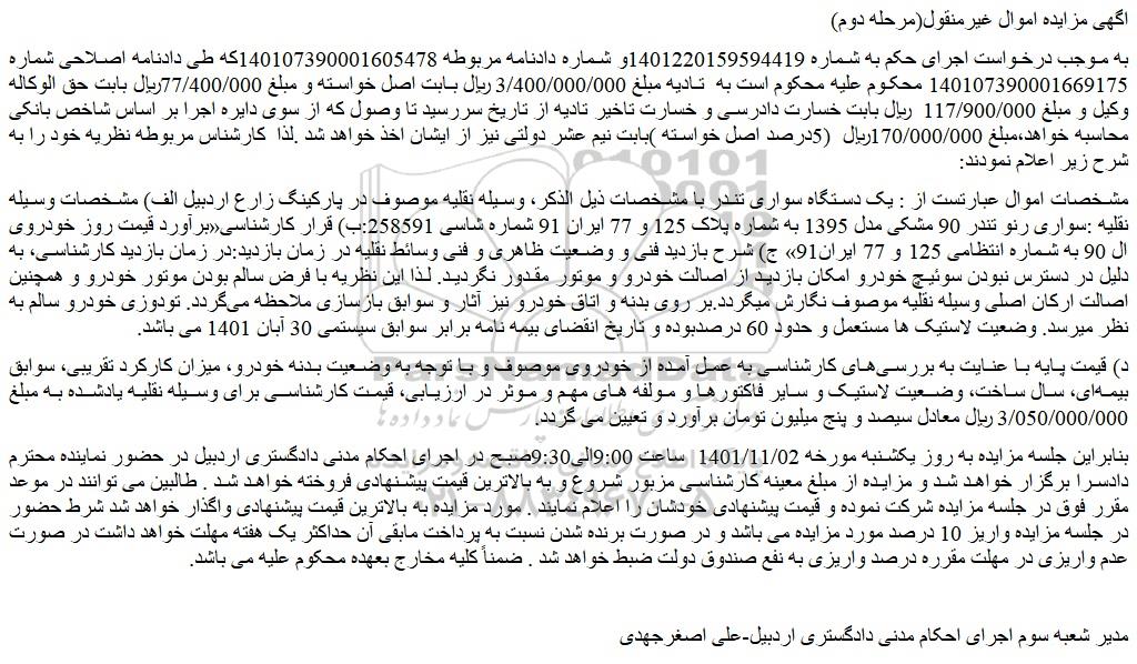 بنابراین جلسه مزایده به روز یکشنبه مورخه 1401/11/02 ساعت 9:00الی9:30صبح در اجرای احکام مدنی دادگستری اردبیل در حضور نماینده محترم دادسرا برگزار خواهد شد و مزایده از مبلغ معینه کارشناسی مزبور شروع و به بالاترین قیمت پیشنهادی فروخته خواهد شد . طالبین می توانند در موعد مقرر فوق در جلسه مزایده شرکت نموده و قیمت پیشنهادی خودشان را اعلام نمایند . مورد مزایده به بالاترین قیمت پیشنهادی واگذار خواهد شد شرط حضور در جلسه مزایده واریز 10 درصد مورد مزایده می باشد و در صورت برنده شدن نسبت به پرداخت مابقی آن حداکثر یک هفته مهلت خواهد داشت در صورت عدم واریزی در مهلت مقرره درصد واریزی به نفع صندوق دولت ضبط خواهد شد . ضمناً کلیه مخارج بعهده محکوم علیه می باشد.