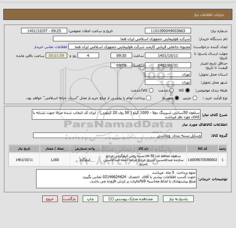 شرح کلی نیاز: سلفون 50سانتی شیرینگ دولا - 1000 کیلو ( 50 رول 20 کیلویی) - ایران کد انتخاب شده صرفا جهت تشابه با کالای مورد نظر میباشد