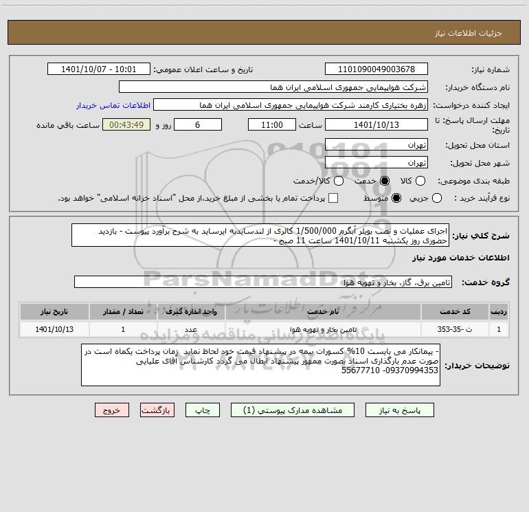 شرح کلی نیاز: اجرای عملیات و نصب بویلر آبگرم 1/500/000 کالری از لندسایدبه ایرساید به شرح برآورد پیوست - بازدید حضوری روز یکشنبه 1401/10/11 ساعت 11 صبح -