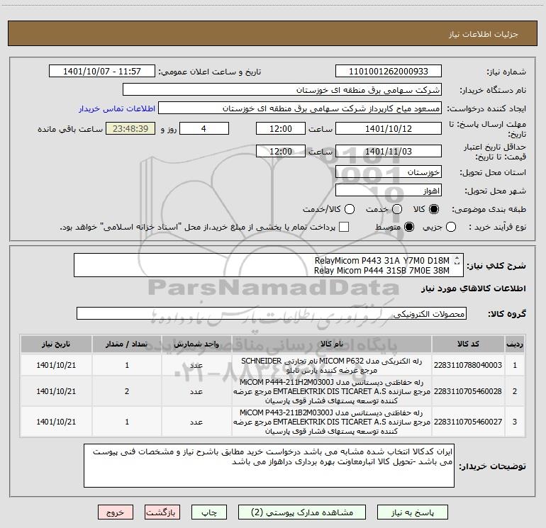 | 1 | 2283110788040003 | رله الکتریکی مدل MICOM P632 نام تجارتی SCHNEIDER مرجع عرضه کننده پارس تابلو | عدد | 1 | 1401/10/21 |