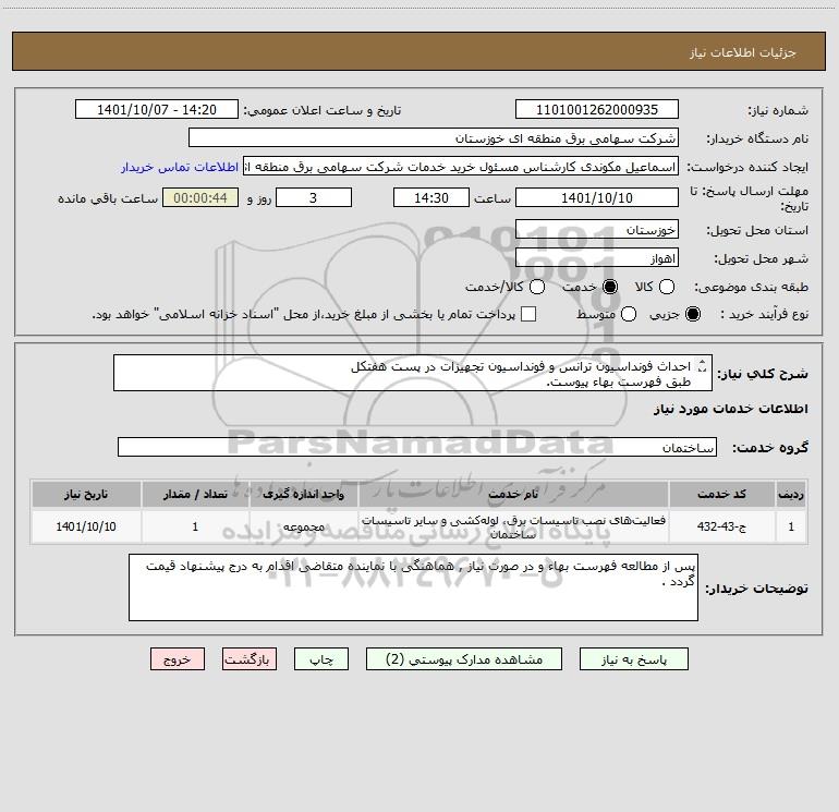 شرح کلی نیاز: احداث فونداسیون ترانس و فونداسیون تجهیزات در پست هفتکل