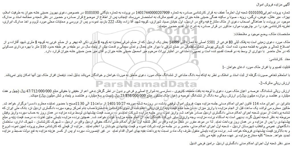 بنابراین در اجرای ماده 114 قانون اجرای احکام مدنی جلسه مزایده جهت فروش اموال توقیفی یادشده در روزسه شنبه مورخه 1401/10/27 از ساعت11 الی 11:30صبح با حضور نماینده محترم دادسرا برگزار خواهد شد. طالبین محترم می توانند یک ساعت قبل از انجام مزایده با واریز میزان ده در صد مبلغ قیمت پایه ارزش ریالی اعلام شده از سوی کارشناس به شماره حساب بنام تمرکز وجوه سپرده دادگستری اردبیل نزد بانک ملی ایران که شناسه پرداخت از سوی شعبه اجرای احکام مدنی دادگستری اردبیل صادر خواهد شد واریز نموده ودر جلسه مزایده شرکت نمایندو ده درصد قیمت پیشنهادی توسط برنده مزایده در همان روز به حساب سپرده واریز وفیش مربوطه به دفتر شعبه تحویل گردد بدیهی است به استثناء برنده مزایده، وجه واریزی سایر شرکت کنندگان بعد از اتمام جلسه مزایده عودت خواهد شد. همچنین برنده مزایده بایستی مابین تفاوت ده درصد قیمت پایه و مبلغ پیشنهادی را پس از مزایده و در همان روز پرداخت نماید. لذا در موعد مقرر در محل مزایده واقع در دفتر شعبه اول اجرای احکام مدنی دادگاه حقوقی اردبیل واقع در اردبیل – شهرک کارشناسان - شهرک اداری- ساختمان دادگاههای عمومی وانقلاب شهرستان اردبیل - شعبه اول اجرای احکام مدنی، حاضر و در جلسه مزایده شرکت نموده و قیمت پیشنهادی خودشان را اعلام نمایند . مزایده از قیمتی که کارشناس محترم پرونده تعیین نموده شروع و به بالاترین قیمت پیشنهادی فروخته خواهد شد. برنده مزایده بایستی منقول ظرف یک ماه و نسبت به پرداخت بقیه بهای اموال اقدام نماید  در غیر اینصورت، سپرده او پس از کسر هزینه مزایده به نفع دولت ضبط و مزایده تجدید خواهد. ضمنا" کلیه مخارج مزایده بر عهده محکوم علیه می باشد.