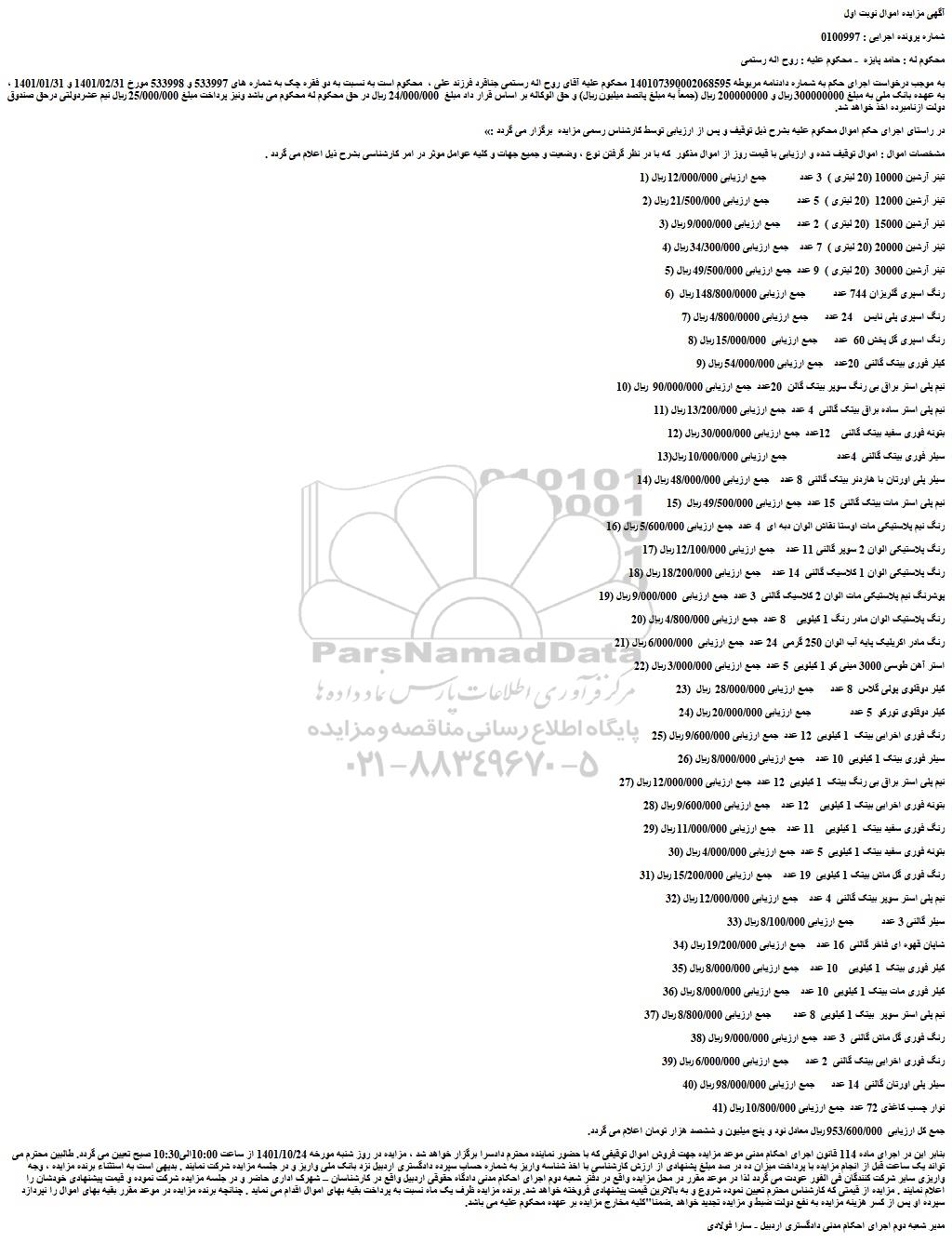 بنابر این در اجرای ماده 114 قانون اجرای احکام مدنی موعد مزایده جهت فروش اموال توقیفی که با حضور نماینده محترم دادسرا برگزار خواهد شد ، مزایده در روز شنبه مورخه 1401/10/24 از ساعت 10:00الی10:30 صبح تعیین می گردد. طالبین محترم می تواند یک ساعت قبل از انجام مزایده با پرداخت میزان ده در صد مبلغ پشنهادی از ارزش کارشناسی با اخذ شناسه واریز به شماره حساب سپرده دادگستری اردبیل نزد بانک ملی واریز و در جلسه مزایده شرکت نمایند . بدیهی است به استثناء برنده مزایده ، وجه واریزی سایر شرکت کنندگان فی الفور عودت می گردد لذا در موعد مقرر در محل مزایده واقع در دفتر شعبه دوم اجرای احکام مدنی دادگاه حقوقی اردبیل واقع در کارشناسان – شهرک اداری حاضر و در جلسه مزایده شرکت نموده و قیمت پیشنهادی خودشان را اعلام نمایند . مزایده از قیمتی که کارشناس محترم تعیین نموده شروع و به بالاترین قیمت پیشنهادی فروخته خواهد شد. برنده مزایده ظرف یک ماه نسبت به پرداخت بقیه بهای اموال اقدام می نماید . چنانچه برنده مزایده در موعد مقرر بقیه بهای اموال را نپردازد سپرده او پس از کسر هزینه مزایده به نفع دولت ضبط و مزایده تجدید خواهد .ضمنا"کلیه مخارج مزایده بر عهده محکوم علیه می باشد.