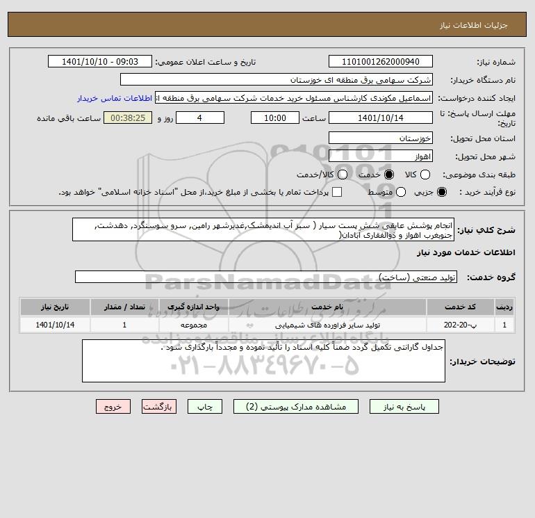 استعلام انجام پوشش عایقی شش پست سیار ( سبز آب اندیمشک,غدیرشهر رامین, سرو سوسنگرد, دهدشت, جنوبغرب اهواز و ذوالفقاری آبادان(, استعلام انجام پوشش عایقی شش پست سیار ( سبز آب اندیمشک,غدیرشهر رامین, سرو سوسنگرد, دهدشت, جنوبغرب اهواز و ذوالفقاری آبادان(