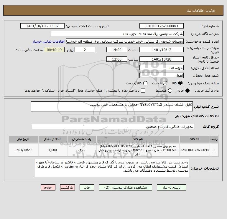 شرح کلی نیاز: کابل افشان شیلدار NYSLCY3*1.5 مطابق با مشخصات فنی پیوست