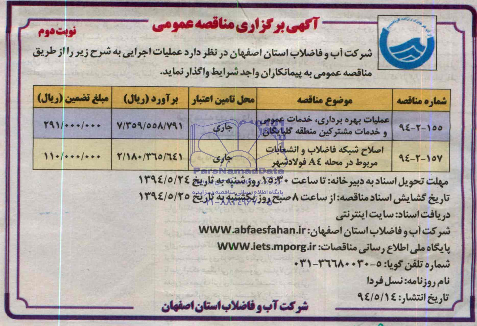 | 94-2-157 | اصلاح شبکه فاصضلاب و انشعابات مربوط در محله A4 فولادشهر |