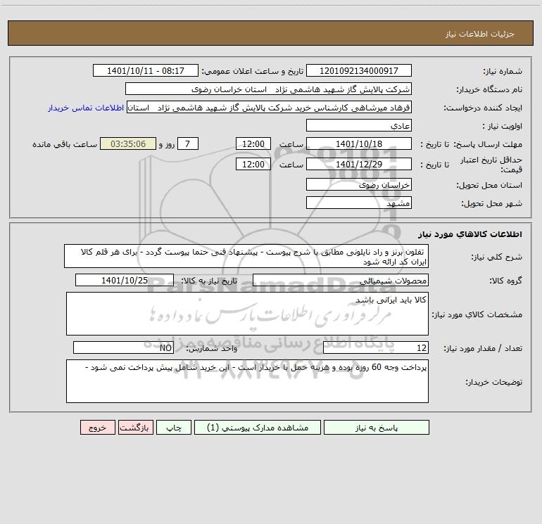 نام دستگاه خریدار:شرکت پالایش گاز شهید هاشمی نژاد استان خراسان رضوی