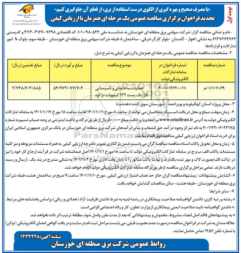 | 01/1011069/م | 2001001262000110 | عملیات ساختمانی و تاسیساتی توسعه پست 132 کیلوولت دژکوه | 54.972.077.704 | 2.748.603.885 |