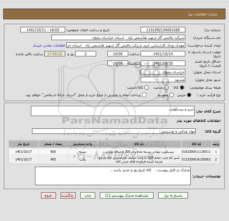 شرح کلی نیاز: شیر و بیسکوئیت