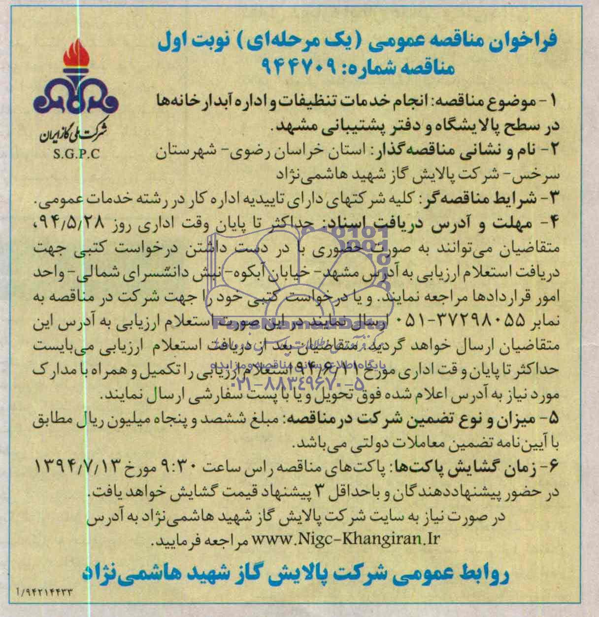 موضوع مناقصه: انجام خدمات تنظیفات و اداره آبدارخانه ها در سطح پالایشگاه و دفتر پشتیبانی مشهد