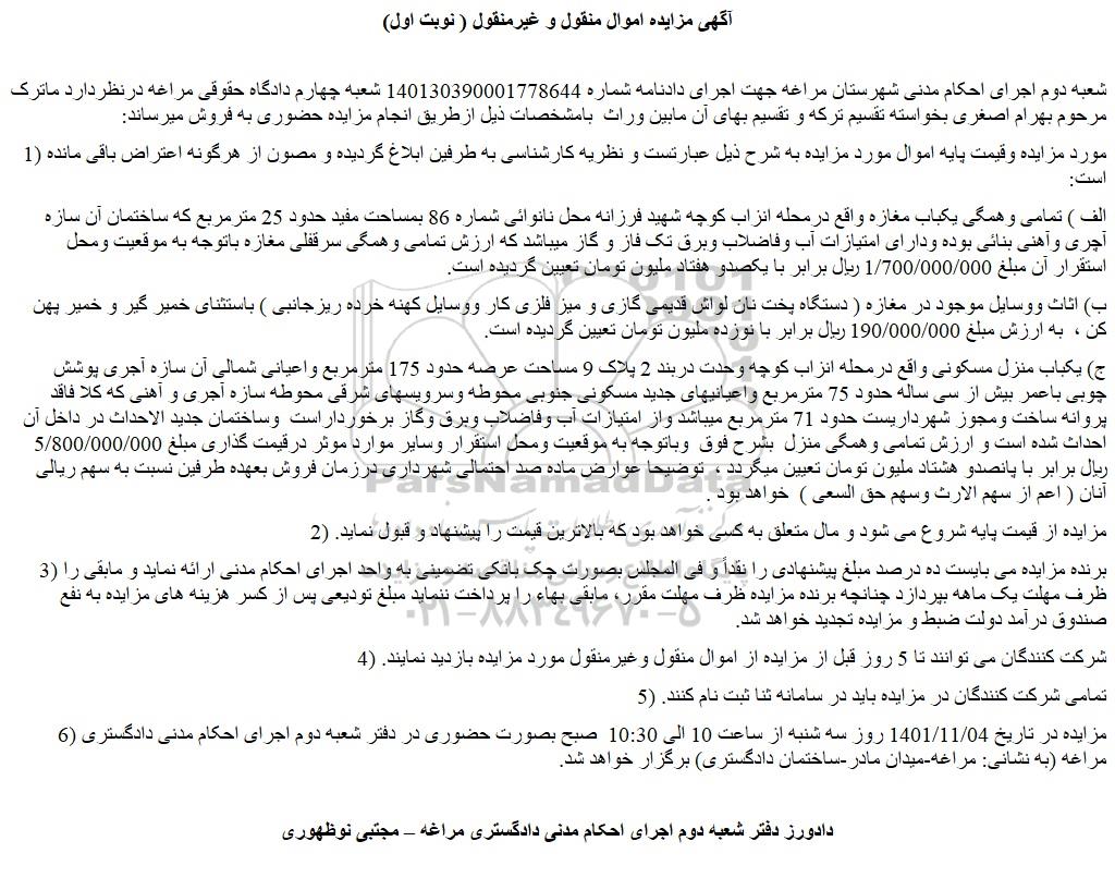 شعبه دوم اجرای احکام مدنی شهرستان مراغه جهت اجرای دادنامه شماره 140130390001778644 شعبه چهارم دادگاه حقوقی مراغه درنظردارد ماترک مرحوم بهرام اصغری بخواسته تقسیم ترکه و تقسیم بهای آن مابین وراث بامشخصات ذیل ازطریق انجام مزایده حضوری به فروش میرساند:
