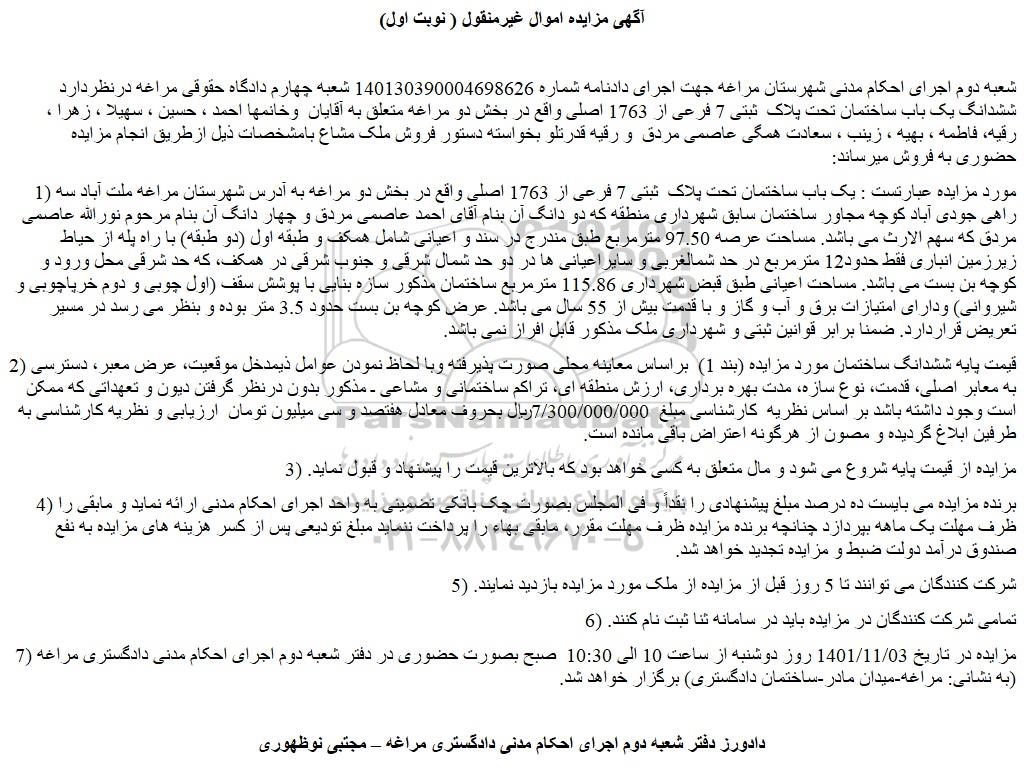 شعبه دوم اجرای احکام مدنی شهرستان مراغه جهت اجرای دادنامه شماره 140130390004698626 شعبه چهارم دادگاه حقوقی مراغه درنظردارد ششدانگ یک باب ساختمان تحت پلاک  ثبتی 7 فرعی از 1763 اصلی واقع در بخش دو مراغه متعلق به آقایان  وخانمها احمد ، حسین ، سهیلا ، زهرا ،  رقیه، فاطمه ، بهیه ، زینب ، سعادت همگی عاصمی مردق  و رقیه قدرتلو بخواسته دستور فروش ملک مشاع بامشخصات ذیل ازطریق انجام مزایده حضوری به فروش میرساند: