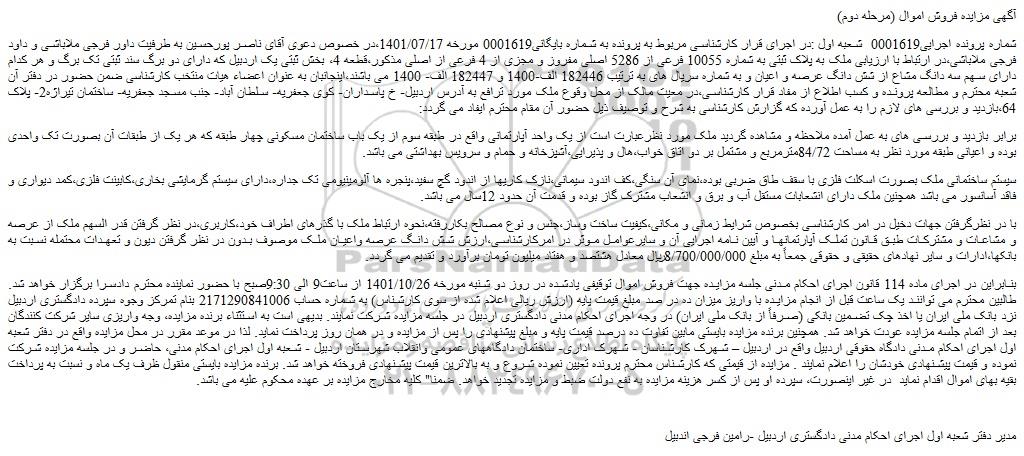 شماره پرونده اجرایی0001619  شعبه اول :در اجرای قرار کارشناسی مربوط به پرونده به شماره بایگانی0001619 مورخه 1401/07/17،در خصوص دعوی آقای ناصر پورحسین به طرفیت داور فرجی ملاباشی و داود فرجی ملاباشی،در ارتباط با ارزیابی ملک به پلاک ثبتی به شماره 10055 فرعی از 5286 اصلی مفروز و مجزی از 4 فرعی از اصلی مذکور،قطعه 4، بخش ثبتی یک اردبیل که دارای دو برگ سند ثبتی تک برگ و هر کدام دارای سهم سه دانگ مشاع از شش دانگ عرصه و اعیان و به شماره سریال های به ترتیب 182446 الف-1400 و 182447 الف- 1400 می باشند،اینجانبان به عنوان اعضاء هیات منتخب کارشناسی ضمن حضور در دفتر آن شعبه محترم و مطالعه پرونده و کسب اطلاع از مفاد قرار کارشناسی،در معیت مالک از محل وقوع ملک مورد ترافع به آدرس اردبیل- خ پاسداران- کوی جعفریه- سلطان آباد- جنب مسجد جعفریه- ساختمان تیراژه2- پلاک 64،بازدید و بررسی های لازم را به عمل آورده که گزارش کارشناسی به شرح و توصیف ذیل حضور آن مقام محترم ایفاد می گردد: