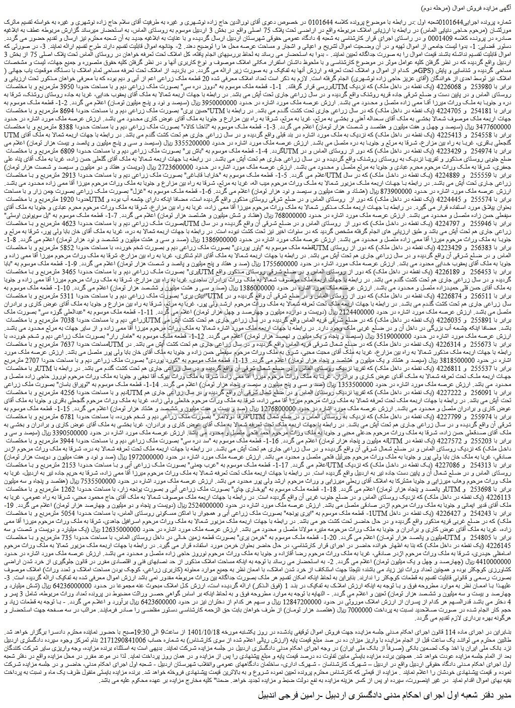 شماره پرونده اجرایی0101644شعبه اول :در رابطه با موضوع پرونده کلاسه 0101644 در خصوص دعوی آقای نورالدین حاج زاده نوشهری و غیره به طرفیت آقای سلام حاج زاده نوشهری و غیره به خواسته تقسیم ماترک مورثشان (مرحوم حاجی دنیایی الماس) در رابطه با ارزیابی املاک مربوطه واقع در اراضی تحت پلاک 75 اصلی واقع در بخش 3 اردبیل موسوم به روستای الماس، به استحضار میرساند گزارش مربوطه عطف به ابلاغیه صادره در پرونده کلاسه 0001409 و در راستای اجرای قرار کارشناسی به شعبه 4 دادگاه عمومی حقوقی شهرستان اردبیل ارسال گردیده و با عنایت به ابلاغیه جدید به آن شعبه محترم نیز ارسال و تقدیم حضور می گردد. دستور قضایی: 1- بدوا لیست جامعی از اموال تھیه و در آن وضعیت اموال تشریح و اعیانی و اشجار و مساحت عرصه محل ھا را توضیح دھند. 2- چنانچه اموال قابلیت تقسیم دارند طرح تقسیم ارائه نمایند. 3- در صورتی که اموال قابلیت تقسیم نداشته باشند قیمت اموال را به صورت جداگانه تعیین نمایند. - بدوا به استحضار می رساند به لحاظ بررسیهای انجام یافته، کل املاک تحت تعرفه خواهان در روستای الماس تحت پلاک اصلی 75 از بخش 3 اردبیل واقع گردیده که در نظر گرفتن کلیه عوامل موثر در موضوع کارشناسی و با ملحوظ داشتن استقرار مکانی املاک موصوف و نوع کاربری آنها و در نظر گرفتن کلیه حقوق متصوره و جمیع جهات، لیست و مشخصات هر کدام از اموال و املاک تحت تعرفه و ارزش آنها به تفکیک و به صورت زیر ارائه می گردد. در بازدید از املاک تحت تعرفه مساحی تمام املاک با دستگاه موقعیت یاب جهانی (GPS) مساحی گردیده و شناسایی و پایش املاک نیز توسط احدی از خواندگان (آقای عزیز حاجی زاده نوشهری) انجام گرفته است. لازم به ذکر است تعداد املاک معرفی شده 20 قطعه ملک زراعی اعم از آبی و دیم بوده که با معرفی خواهان مذکور تحت ارزیابی و بررسی قرار گرفتند.  1-1- قطعه ملک موسوم به "دووز دره سی" بصورت ملک زراعی دیم و با مساحت حدودا 3950 مترمربع و با مختصات UTM برابر با 253980  و 4226068 (یک نقطه در داخل ملک) که نزدیک روستای الماس و در پایین دست و ضلع شرقی جاده قریه روشنک واقع گردیده و در سال زراعی جاری تحت آیش می باشد. در رابطه با جهات اربعه شمالا به ملک آقای یعقوب خدایی، غربا به جاده روستای روشنک، شرقا به دره و جنوبا به ملک وراث میرزا آقا ممی زاده متصل و محدود می باشد. ارزش عرصه ملک مورد اشاره در حدود 3950000000 ریال (سیصد و نود و پنج میلیون تومان) اعلام می گردد. 2-1- قطعه ملک موسوم به "حسین یری" بصورت ملک زراعی دیم و با مساحت حدودا 8694 مترمربع و با مختصات UTM برابر با 254181  و 4224705 (یک نقطه در داخل ملک) که در سال زراعی جاری تحت کشت گندم می باشد. در رابطه با جهات اربعه ملک موصوف شمالا بخشی به ملک آقای سعداله آهنی و بخشی به مرتع، غربا به مرتع، شرقا به راه بین مزارع و جنوبا به ملک آقای عوض کاری محدود می باشد. ارزش عرصه ملک مورد اشاره در حدود 3477600000 ریال (سیصد و چهل و هفت میلیون و هفتصد و شصت هزار تومان) اعلام می گردد. 3-1- قطعه ملک موسوم به "تاختا کالاه" بصورت ملک زراعی دیم و با مساحت حدودا 8388 مترمربع و با مختصات UTM برابر با 254558  و 4225413 (یک نقطه در داخل ملک) که نزدیک به ملک مورد اشاره در بند قبلی واقع گردیده و در سال زراعی جاری هم تحت کشت گندم می باشد. در رابطه با جهات اربعه شمالا به ملک آقای گنجعلی باقری، غربا به راه بین مزارع، شرقا به مرتع و جنوبا به دره متصل می باشد. ارزش عرصه ملک مورد اشاره در حدود 3355200000 ریال (سیصد و سی و پنج میلیون و پانصد و بیست هزار تومان) اعلام می گردد. 4-1- قطعه ملک موسوم به "باش یر" بصورت ملک زراعی دیم و با مساحت حدودا 6809 مترمربع و با مختصات UTM برابر با 254974  و 4223429 (یک نقطه در داخل ملک) که دور از روستای الماس و در ضلع جنوبی روستای مذکور و تقریبا نزدیک به روستای روشنک واقع گردیده و در سال زراعی جاری هم تحت آیش می باشد. در رابطه با جهات اربعه شمالا به ملک آقای گلعلی حسن زاده، غربا به ملک آقای پناه علی جعفری، شرقا به ملک وراث مرحوم محرم عبادی و جنوبا به مرتع مت