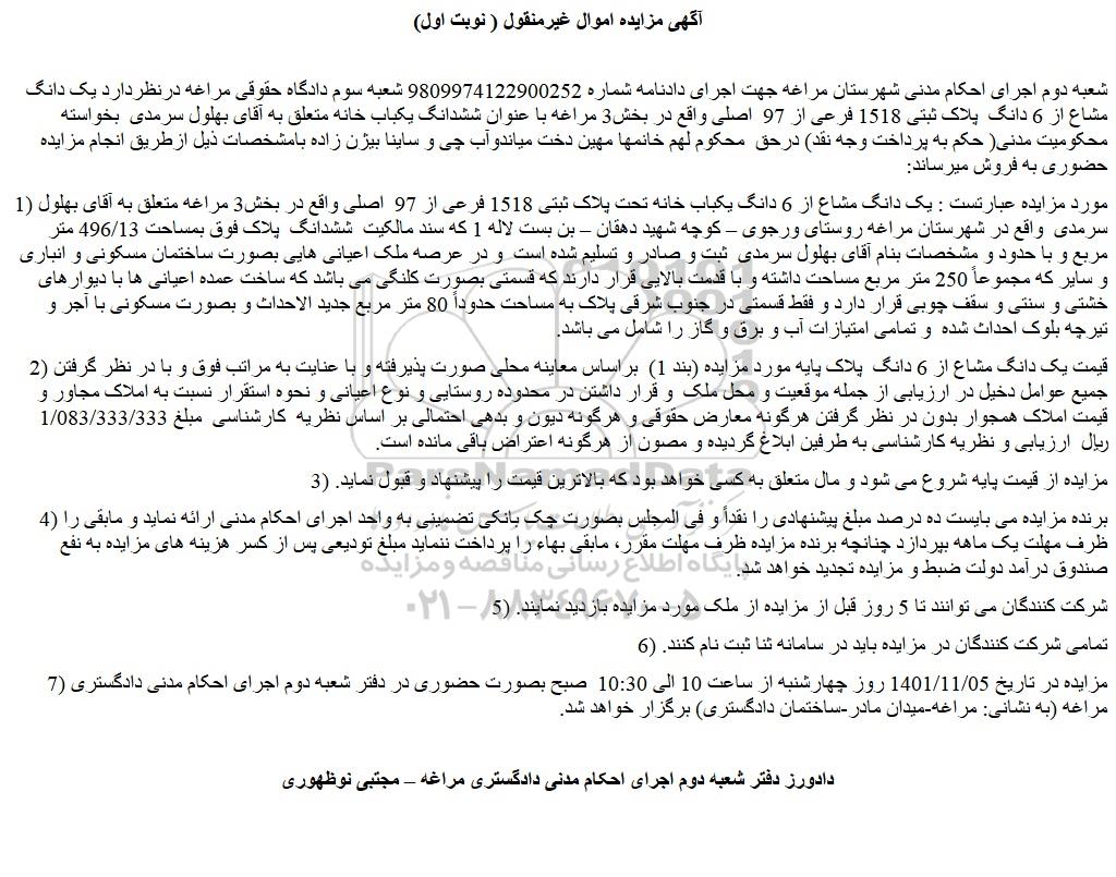شعبه دوم اجرای احکام مدنی شهرستان مراغه جهت اجرای دادنامه شماره 9809974122900252 شعبه سوم دادگاه حقوقی مراغه درنظردارد یک دانگ مشاع از 6 دانگ پلاک ثبتی 1518 فرعی از 97 اصلی واقع در بخش3 مراغه با عنوان ششدانگ یکباب خانه متعلق به آقای بهلول سرمدی بخواسته محکومیت مدنی( حکم به پرداخت وجه نقد) درحق محکوم لهم خانمها مهین دخت میاندوآب چی و ساینا بیژن زاده بامشخصات ذیل ازطریق انجام مزایده حضوری به فروش میرساند: