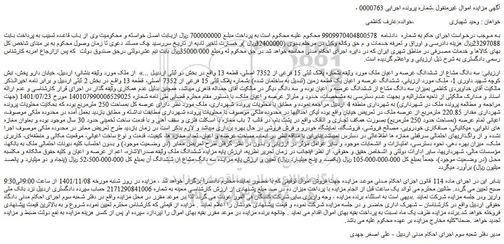آگهی مزایده اموال غیرمنقول ،شماره پرونده اجرایی 0000763 ،