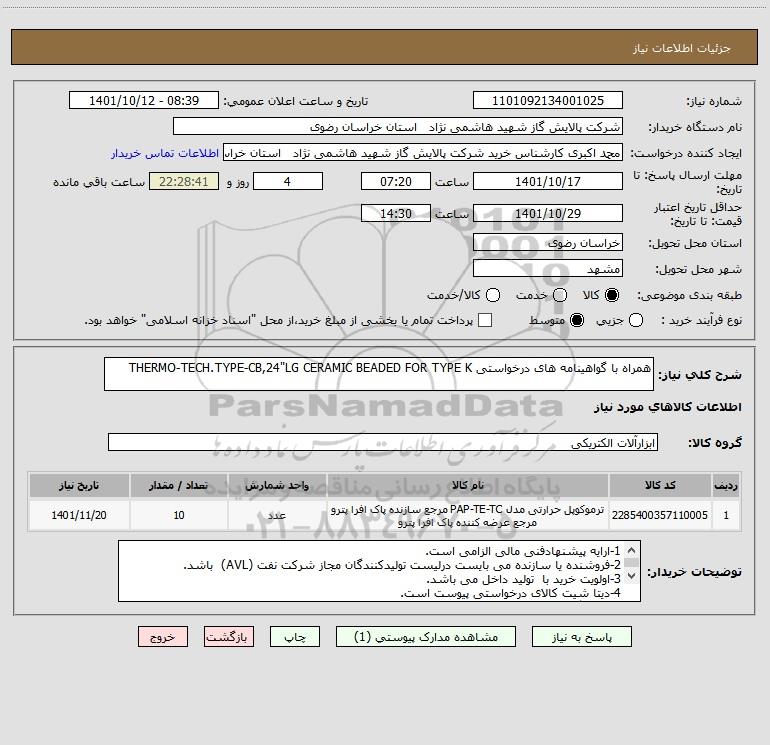 نام دستگاه خریدار:شرکت پالایش گاز شهید هاشمی نژاد استان خراسان رضوی