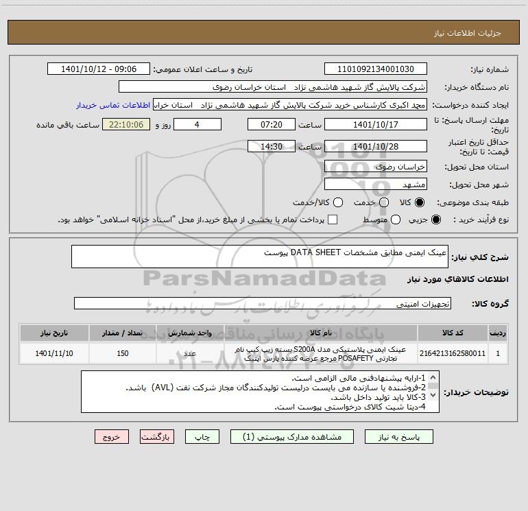 نام دستگاه خریدار:شرکت پالایش گاز شهید هاشمی نژاد استان خراسان رضوی