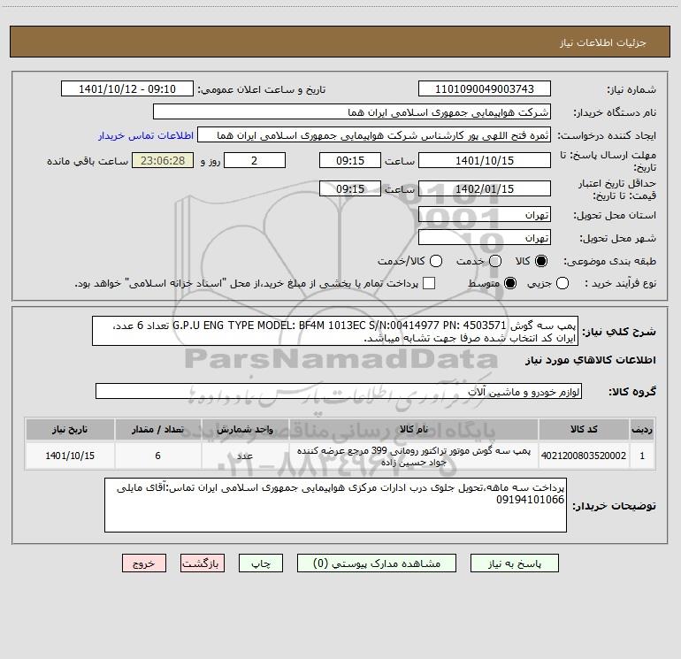 شرح کلی نیاز: پمپ سه گوش G.P.U ENG TYPE MODEL: BF4M 1013EC S/N:00414977 PN: 4503571 تعداد 6 عدد، ایران کد انتخاب شده صرفا جهت تشابه میباشد.