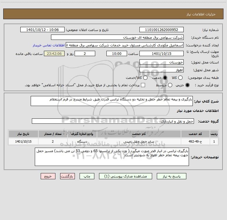 شرح کلی نیاز: بارگیری و بیمه تمام خطر حمل و تخلیه دو دستگاه ترانس قدرت طبق شرایط مندرج در فرم استعلام