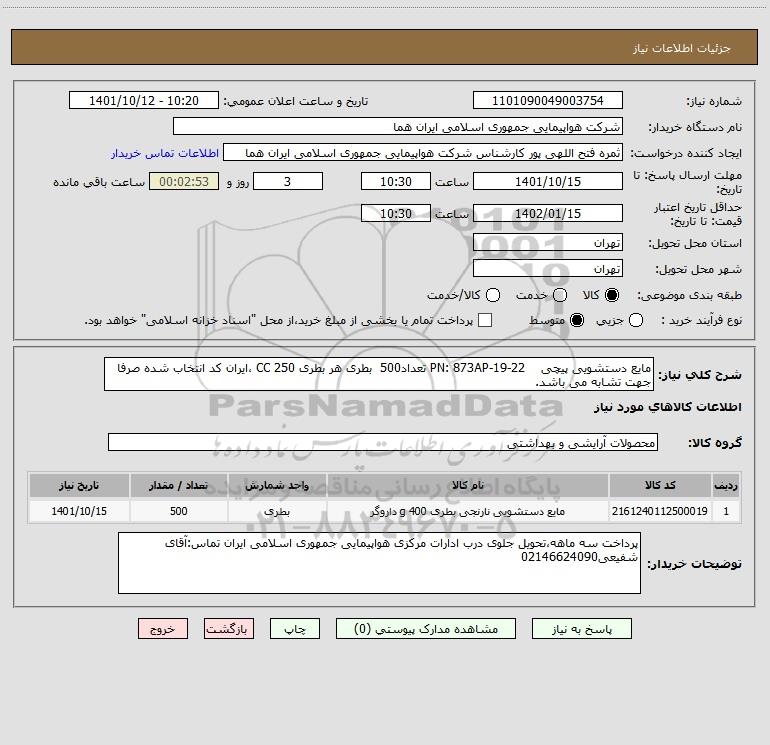 شرح کلی نیاز: مایع دستشویی پیچی PN: 873AP-19-22 تعداد500 بطری هر بطری 250 CC ،ایران کد انتخاب شده صرفا جهت تشابه می باشد.