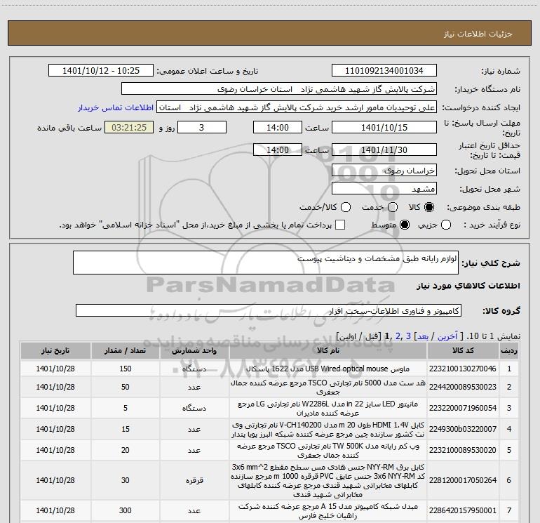 نام دستگاه خریدار:شرکت پالایش گاز شهید هاشمی نژاد استان خراسان رضوی