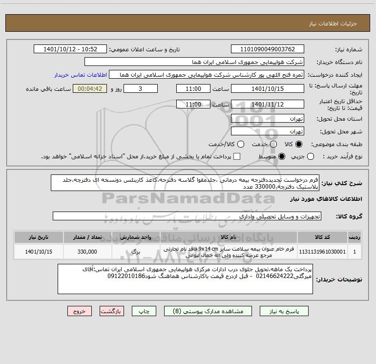 شرح کلی نیاز: فرم درخواست تجدیددفترجه بیمه درمانی ،جلدمقوا گلاسه دفترجه،کاغذ کاربنلس دونسخه ای دفترچه،جلد پلاستیک دفترچه،330000 عدد