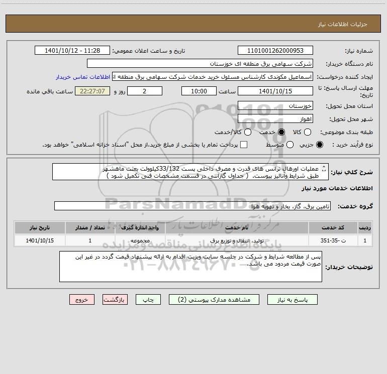 شرح کلی نیاز: عملیات اورهال ترانس های قدرت و مصرف داخلی پست 33/132کیلوولت بعثت ماهشهر