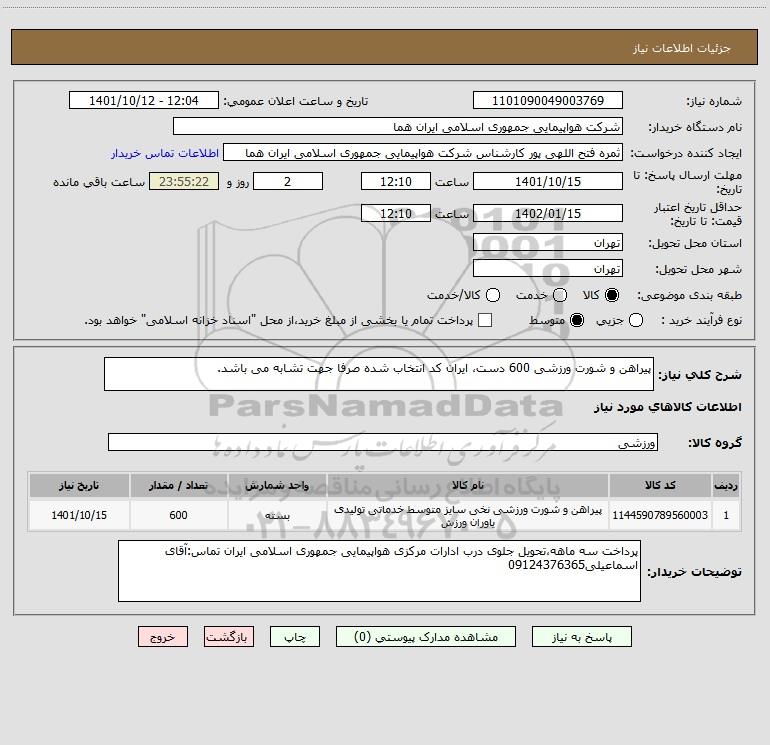 شرح کلی نیاز: پیراهن و شورت ورزشی 600 دست، ایران کد انتخاب شده صرفا جهت تشابه می باشد.