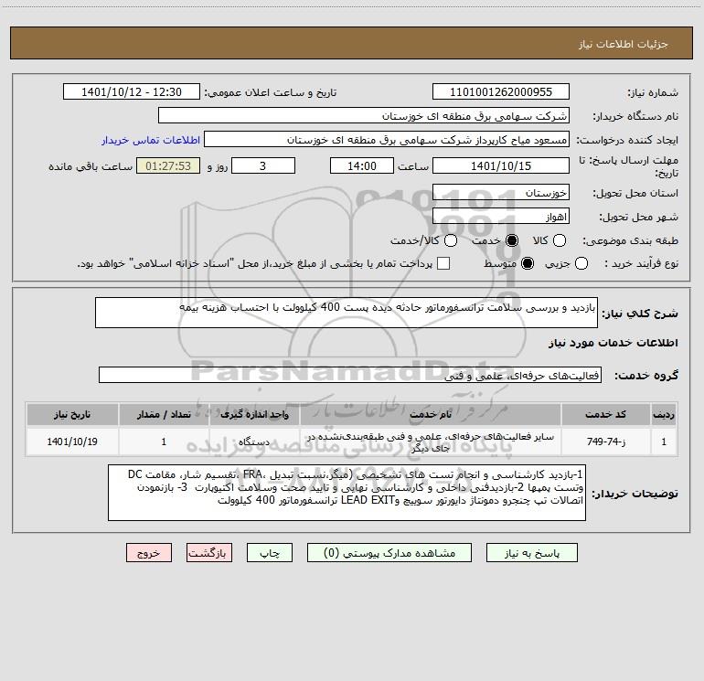 شرح کلی نیاز: بازدید و بررسی سلامت ترانسفورماتور حادثه دیده پست 400 کیلوولت با احتساب هزینه بیمه