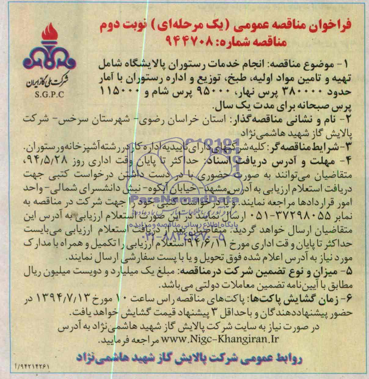 موضوع مناقصه: انجام خدمات رستوران پالایشگاه شامل تهیه و تامین مواد اولیه ، طبخ ، توزیع و اداره رستوران با آمار حدود 380000 پرس نهار ، 95000 پرس شام و 115000 پرس صبحانه برای مدت یک سال