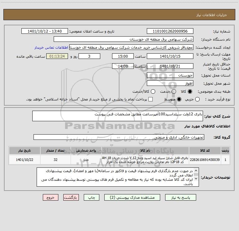 شرح کلی نیاز: باتری 12ولت سیلداسید100آمپرساعت مطابق مشخصات فنی پیوست