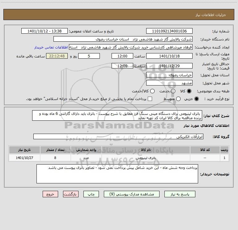 نام دستگاه خریدار:شرکت پالایش گاز شهید هاشمی نژاد استان خراسان رضوی