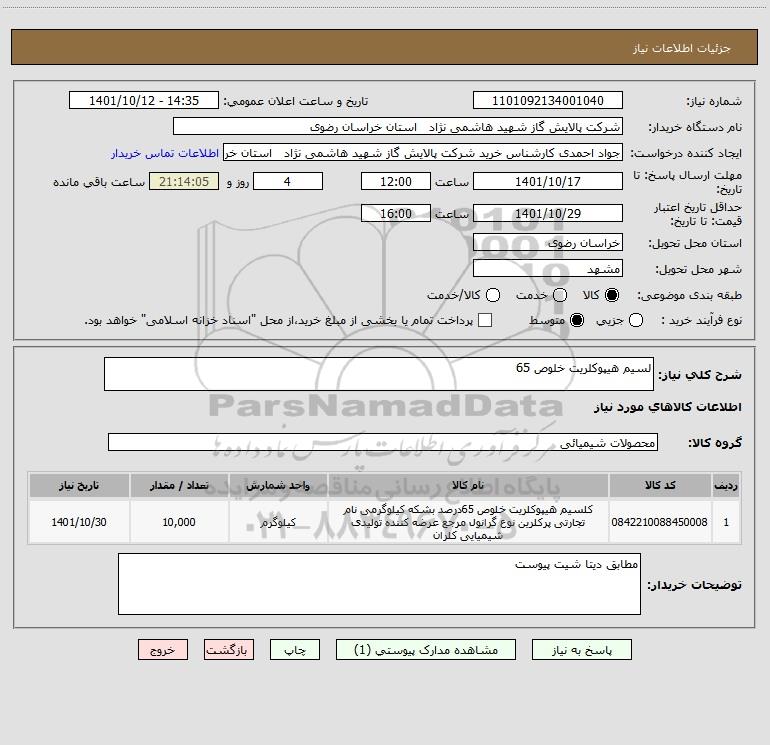 نام دستگاه خریدار:شرکت پالایش گاز شهید هاشمی نژاد استان خراسان رضوی