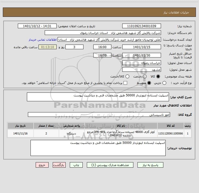 نام دستگاه خریدار:شرکت پالایش گاز شهید هاشمی نژاد استان خراسان رضوی