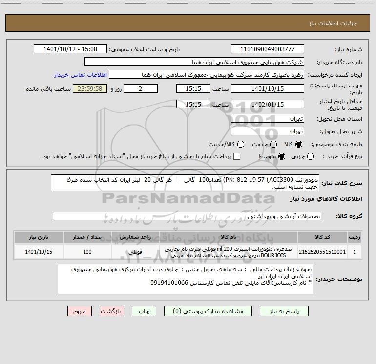 شرح کلی نیاز: دئودورانت PN: 812-19-57 (ACC3300) تعداد100 گالن = هر گالن 20 لیتر ایران کد انتخاب شده صرفا جهت تشابه است.