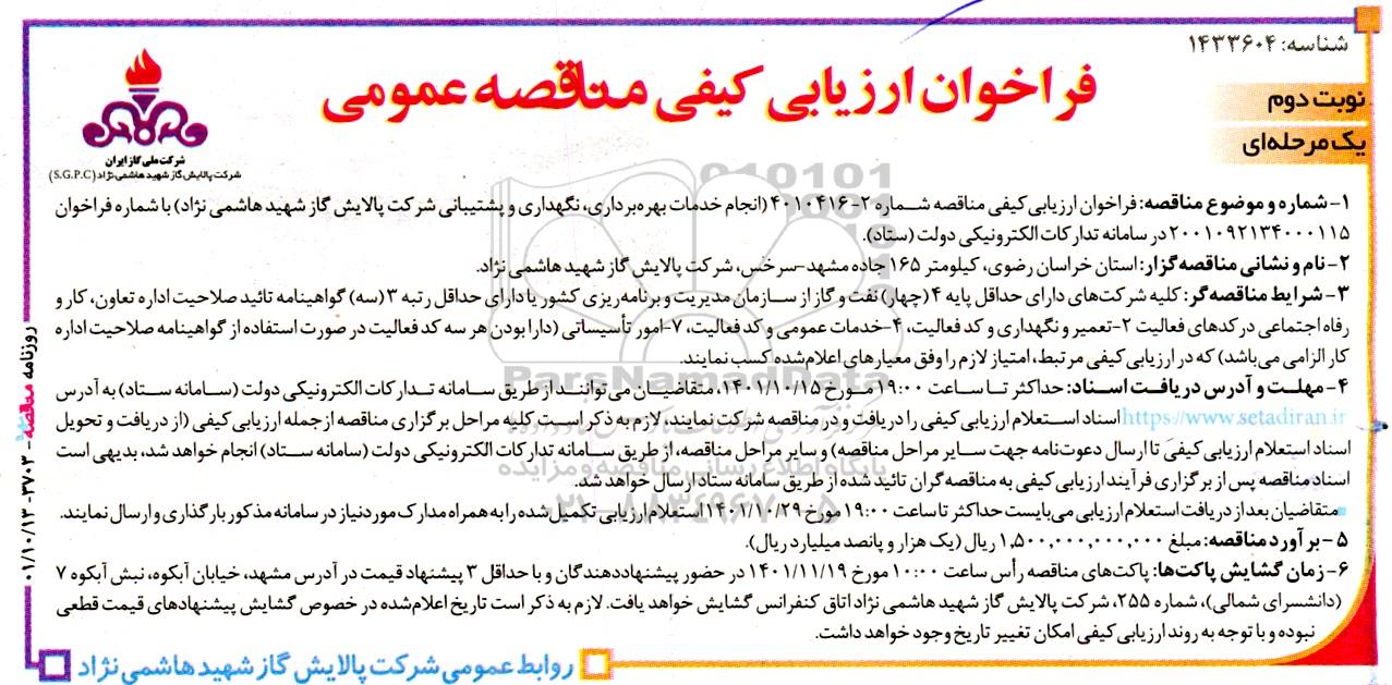 1- شماره و موضوع مناقصه: فراخوان ارزیابی کیفی مناقصه شماره 2 - 4010416 (انجام خدمات بهره برداری، نگهداری و پشتیبانی شرکت پالایش گاز شهید هاشمی نژاد) با شماره فراخوان 2001092134000115 در سامانه تدارکات الکترونیکی دولت ستاد