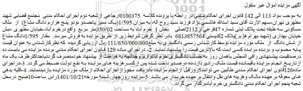 به موجب مواد 113 الی 142 قانون اجرای احکام مدنی در رابطه با پرونده کلاسه 0100375ارجاعی ازشعبه دوم اجرای احکام مدنی مجتمع قضایی شهید مطهری تهران،سهم الارث آقای سید اسدالله هاشمی نژاد فرزند سید روح اله، به میزان 1/595(یک ممیز پانصدو نودو پنج هزارم دانگ مشاع) از ملک مسکونی سه طبقه تحت پلاک ثبتی شماره 47فرعی از2112اصلی بخش 1 خرم آباد به مساحت 350/02متر مربع واقع درخرم آباد-خیابان مطهری -نبش خیابان بهداری (شهید بهرام هژبر)پلاک 2کدپستی 6813857564 بادر نظر گرفتن شرایط زیر از طریق مزایده به فروش میرسد. مقدار 1/595دانگ مشاع از شش دانگ از ملک مورد مزایده توسط کارشناس رسمی دادگستری به مبلغ111/650/000/000 ریال ارزیابی گردیده که نظرکارشناس به عنوان قیمت پایه محسوب و برنده مزایده کسی است که بالاترین قیمت را پیشنهاد نماید. 2- دراجرای ماده 129 قانون اجرای احکام مدنی برنده مزایده می بایست ده درصدقیمت پیشنهادی رافی المجلس یاهمان روز به حساب دادگستری خرم آبادواریزوچنانچه به هرعلت از پیشنهاد خودمنصرف گرددیاحداکثرظرف یک ماه ازتاریخ انجام مزایده باقیمانده قیمت ملک رانپردازد،ده درصدپرداخت شده پس ازکسرهزینه های مزایده به نفع دولت ضبط می گردد. 3-دراجرای ماده126قانون اجرای احکام مدنی طالبین می توانند5روزقبل ازانجام مزایده بادریافت مجوزازاجرای احکام ازملک مورد مزایده بازدیدنمایند. 4-کلیه بدهی های معوقه برعهده مالک وهزینه های نقل وانتقال برعهده خریدار می باشد. 5-مزایده روزچهار شنبه مورخه1401/10/21راس ساعت10صبح درمحل شعبه پنجم اجرای احکام مدنی دادگستری خرم آبادبرگذار می گردد.