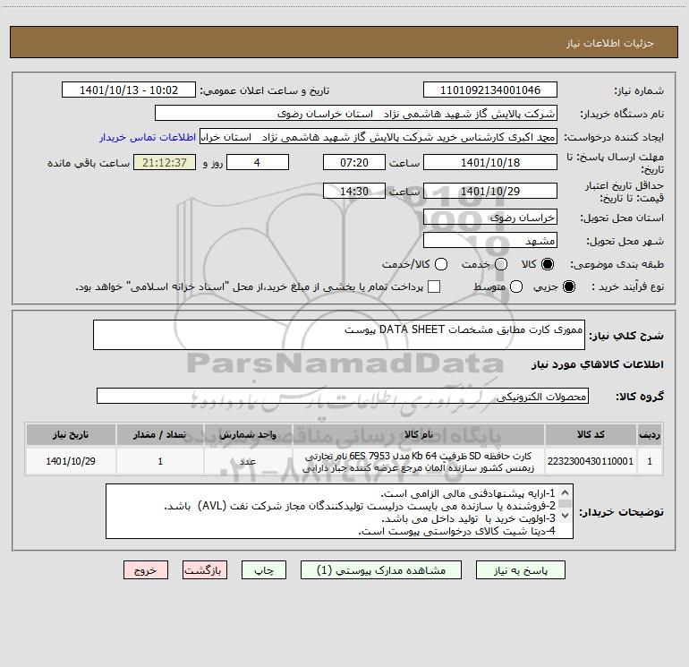 شرح کلی نیاز: مموری کارت مطابق مشخصات DATA SHEET پیوست