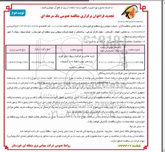 | 1022025/ 01 / م | 2001001262000108 | خرید هادی پرظرفیت پروژه جمع آوری پایه های چوبی خطوط 132 کیلوولت شمالغرب- توحید | 27.675.300.725 | 1.383.765.036 |