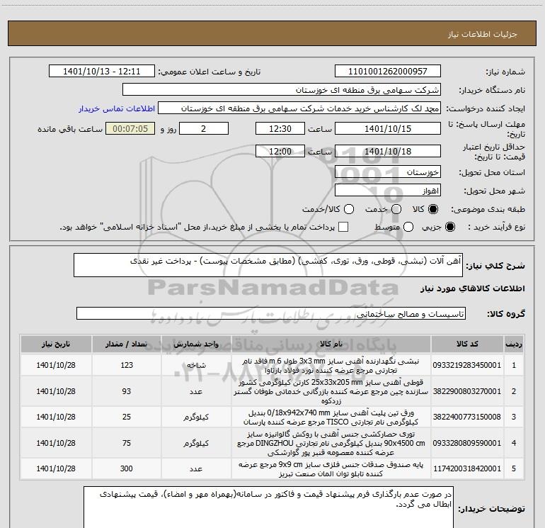 شرح کلی نیاز: آهن آلات (نبشی، قوطی، ورق، توری، کفشی) (مطابق مشخصات پیوست) - پرداخت غیر نقدی