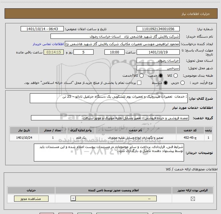 نام دستگاه خریدار:شرکت پالایش گاز شهید هاشمی نژاد استان خراسان رضوی