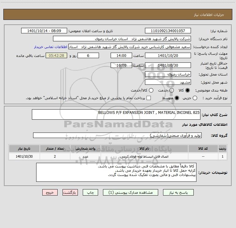 شرح کلی نیاز: BELLOWS P/F EXPANSION JOINT , MATERIAL INCONEL 825