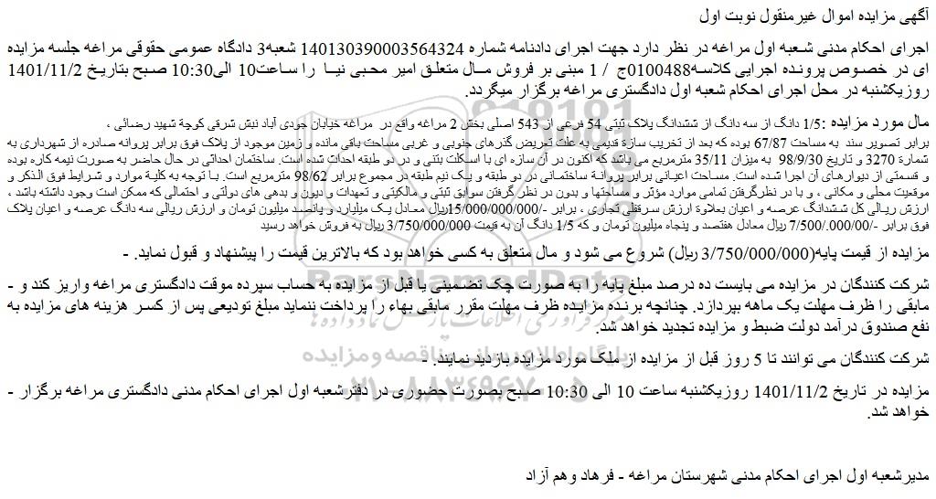 مزایده فروش 1/5 دانگ از سه دانگ از ششدانگ پلاک ثبتی 54 فرعی از 543 اصلی , مزایده فروش 1/5 دانگ از سه دانگ از ششدانگ پلاک ثبتی 54 فرعی از 543 اصلی