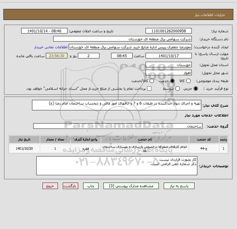 شرح کلی نیاز: تهیه و اجرای دیوار جداکننده در طبقات 6 و 7 و اتاقهای امور مالی و ذیحساب ساختمان امام رضا (ع)
