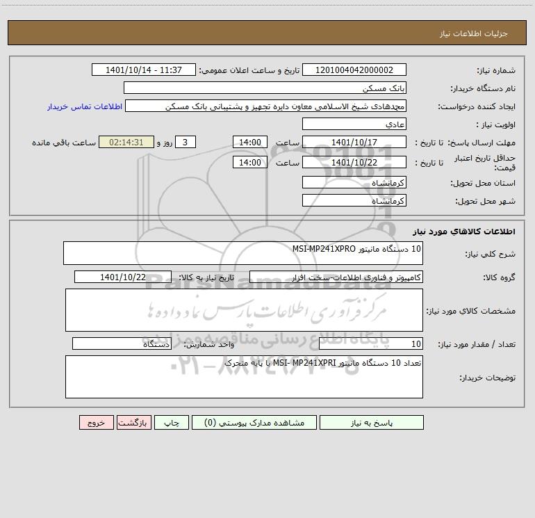 شرح کلی نیاز: 10 دستگاه مانیتور MSI-MP241XPRO