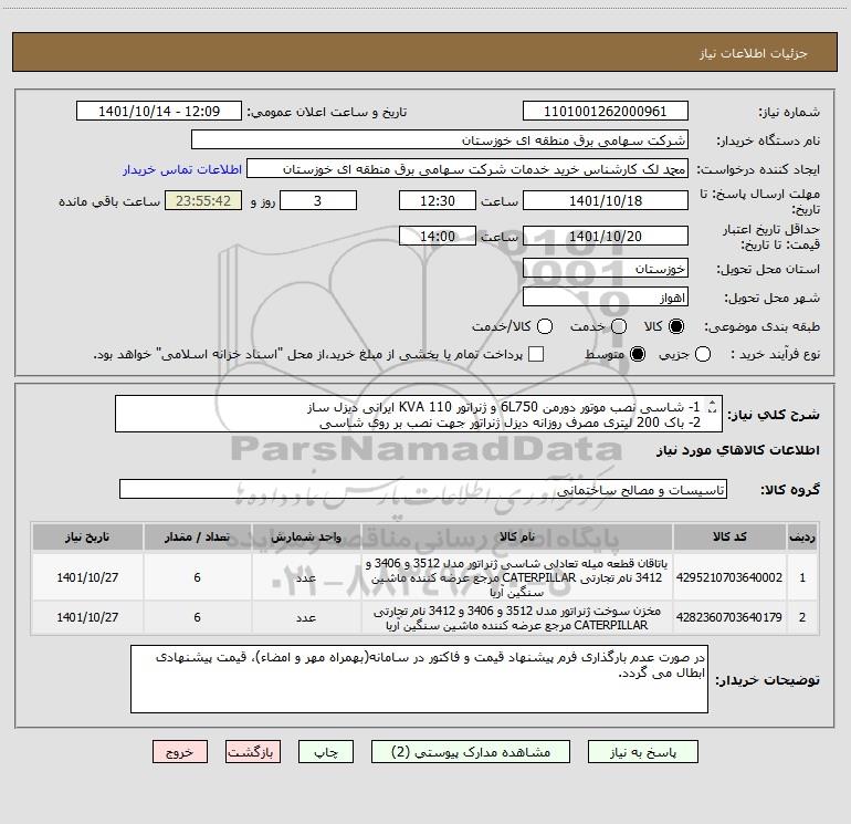 شرح کلی نیاز: 1- شاسی نصب موتور دورمن 6L750 و ژنراتور 110 KVA ایرانی دیزل ساز 2- باک 200 لیتری مصرف روزانه دیزل ژنراتور جهت نصب بر روی شاسی