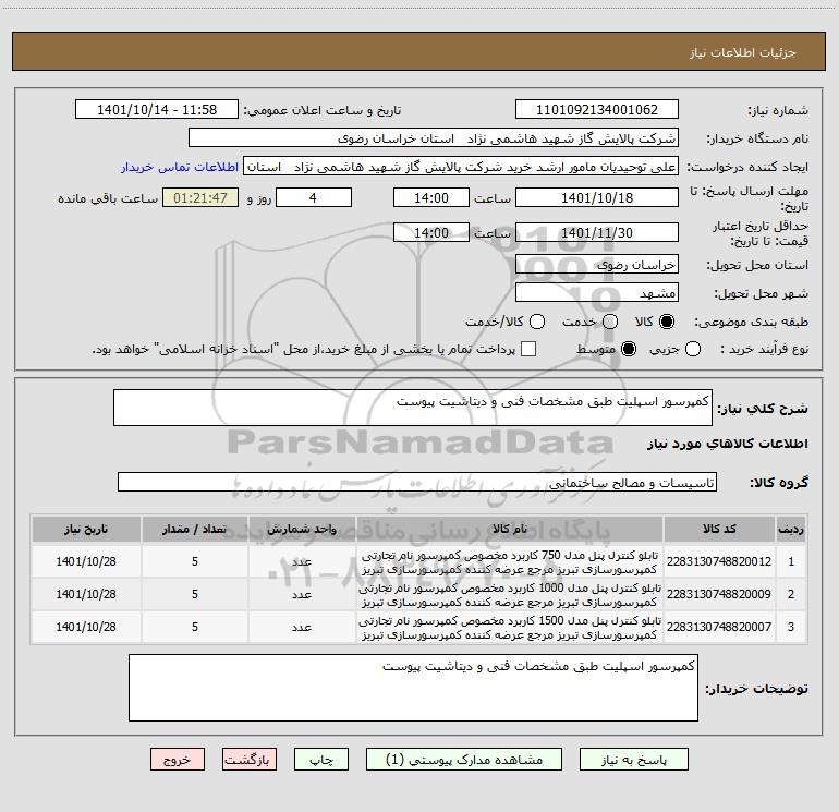 نام دستگاه خریدار:شرکت پالایش گاز شهید هاشمی نژاد استان خراسان رضوی